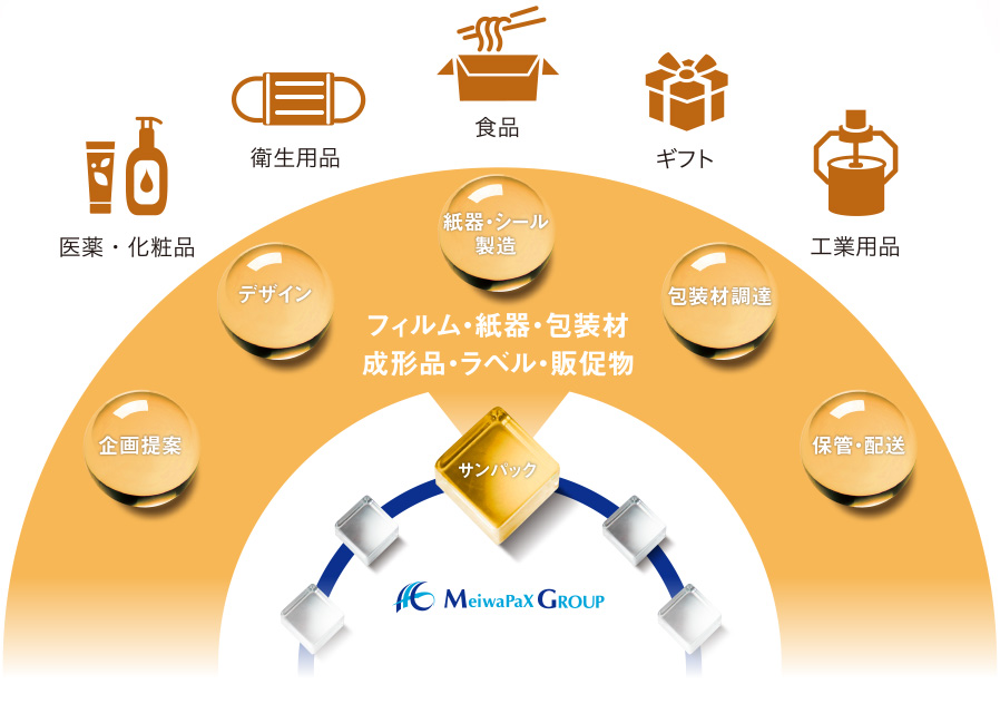 お客様のご要望に、あらゆる方面から手厚くサポートできる総合力がサンパックの提供価値です。福岡を中心に、九州全域、そして首都圏などのお客様のビジネスにも関わっており、市場を見極めるマーケティング、きめ細かなプランニング、独創的な設計・デザインというソフト面からのサポートにはじまり、品質の高いパッケージ、効果的な販促資材の提供というハード面のサポートを合わせてトータルで課題解決に貢献しています。